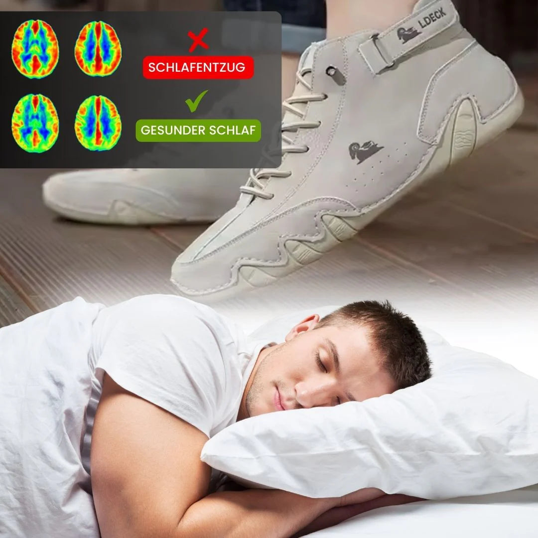 Dank der ergonomischen Sohle, der sanften Dämpfung und der perfekten Passform wird der Körper über den Tag spürbar entlastet. Weniger Schmerzen, weniger Muskelverspannung, weniger Stress für Gelenke und Rücken – all das sorgt dafür, dass Ihr Körper abends besser zur Ruhe kommt und sich nachts optimal regenerieren kann.